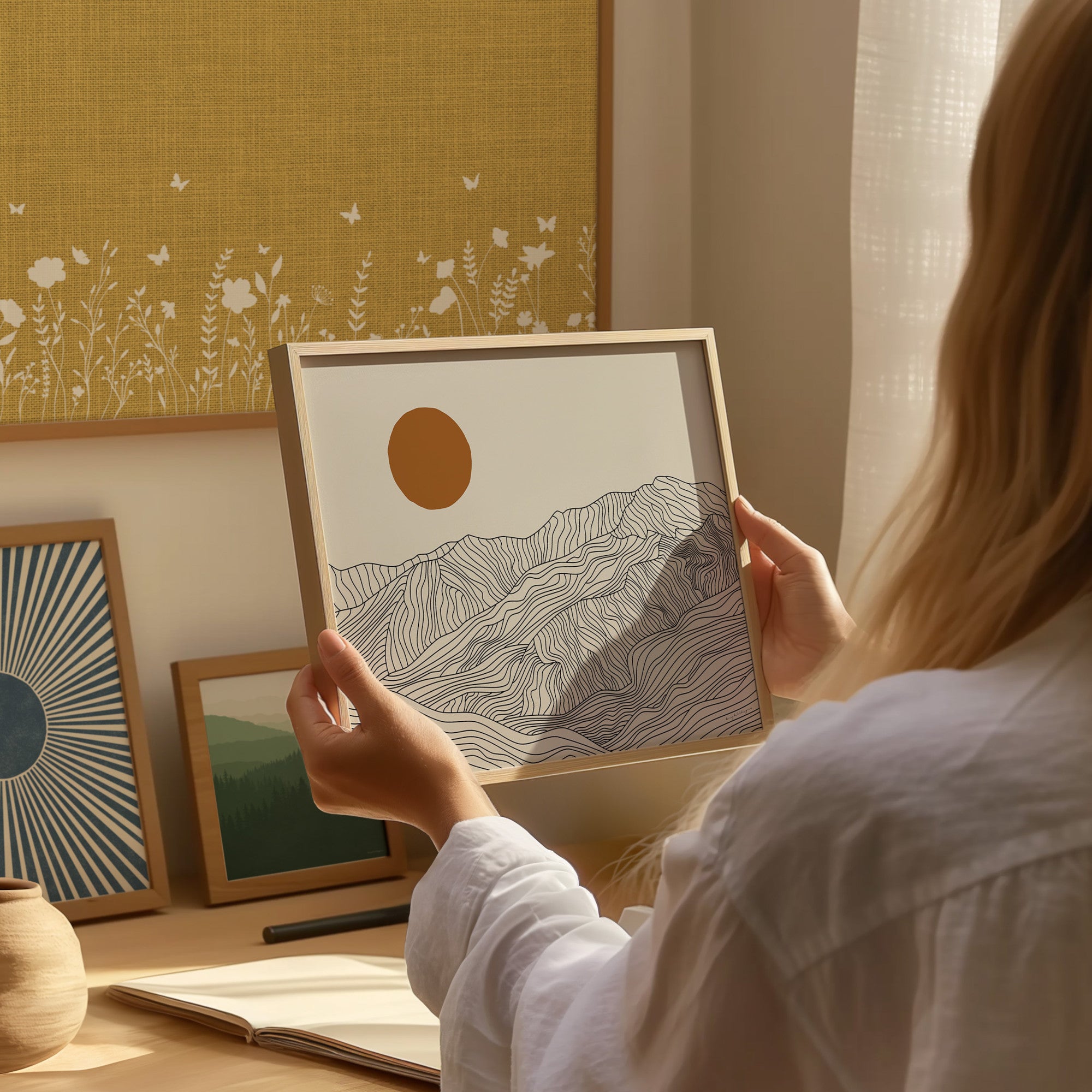 Your print is mounted perfectly flat and dust-free in our handcrafted, sustainable wooden frames, from natural oak to sleek black. Hanging system included. All that’s left for you is choosing the perfect spot on your wall.