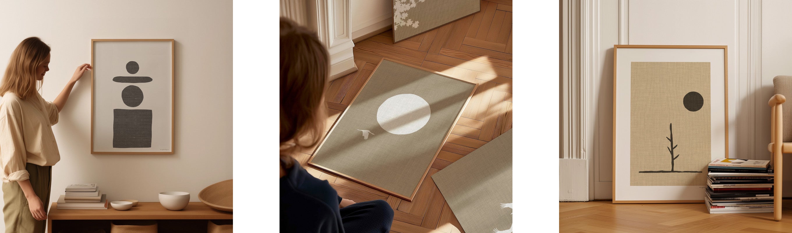 In minimalistische interieurs wordt wanddecoratie vaak gebruikt om interesse toe te voegen zonder afbreuk te doen aan de eenvoudige esthetiek. Grafische prints, abstracte kunst en geometrische ontwerpen zijn populair en worden vaak ingelijst in eenvoudige, strakke lijsten. Less is more is hier het motto, waarbij slechts enkele zorgvuldig gekozen stukken worden tentoongesteld om een statement te maken.