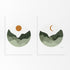 Zie jij de bergen ook als jouw tweede thuis? Dan is deze tweeluik poster echt iets voor jou! Laat je meevoeren door de cirkels met zon, maan en bergen, en voel de rust en vrijheid die de natuur biedt.